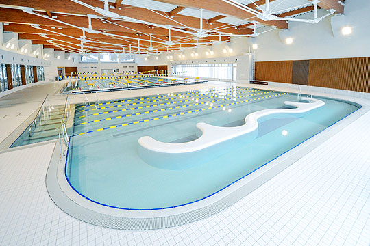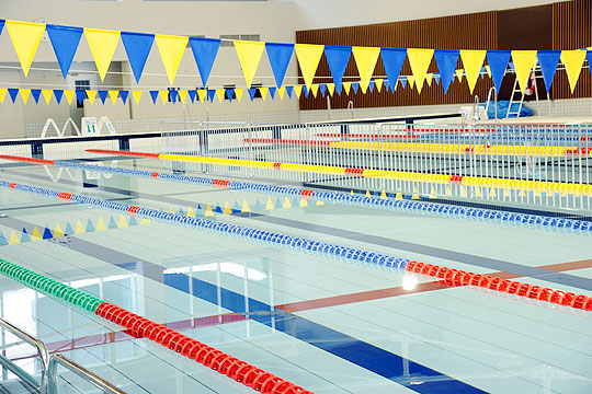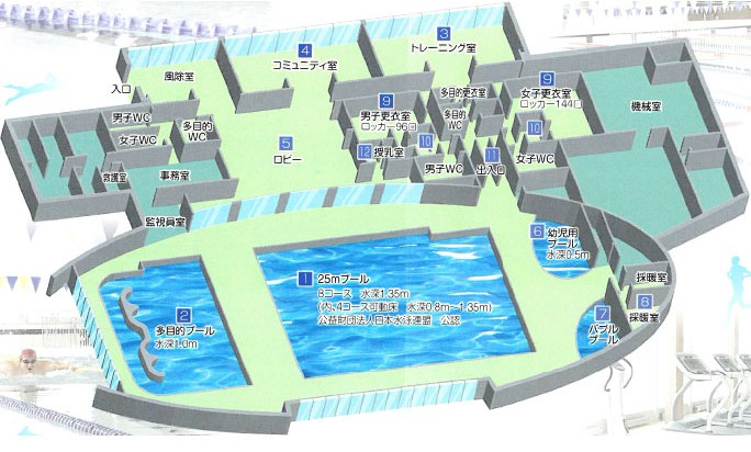 8コース(水深 1.35m うち4コース可動床 水深 0.80~1.35m)日本水泳連盟公認